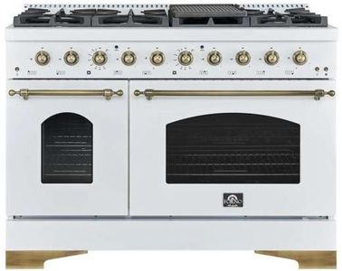 The Massimo 48 inch dual fuel range offers serious cooking power for high-performance kitchens. With 8 sealed gas burners and durable matte cast iron grates, it’s built for everything from rapid boiling to low simmers. The spacious 6.58 cu. ft. electric oven features true convection, multiple bake and broil modes, and a built-in air fryer basket for healthier meals. Finished in a sleek white with antique brass handles, it also includes a wok support, griddle, and a steam-cleaning function for easy maintenance. The speckled blue enamel oven interior adds style and visibility. LP convertible and designed for either freestanding or built-in installation.Read More