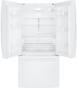 GE Series 33-inch 24.7 cubic foot white French door refrigerator offers spacious storage and efficient cooling for daily use. The French door design allows easy access to fresh foods, while adjustable shelves and compartments help keep items organized with consistent performance.Read More
