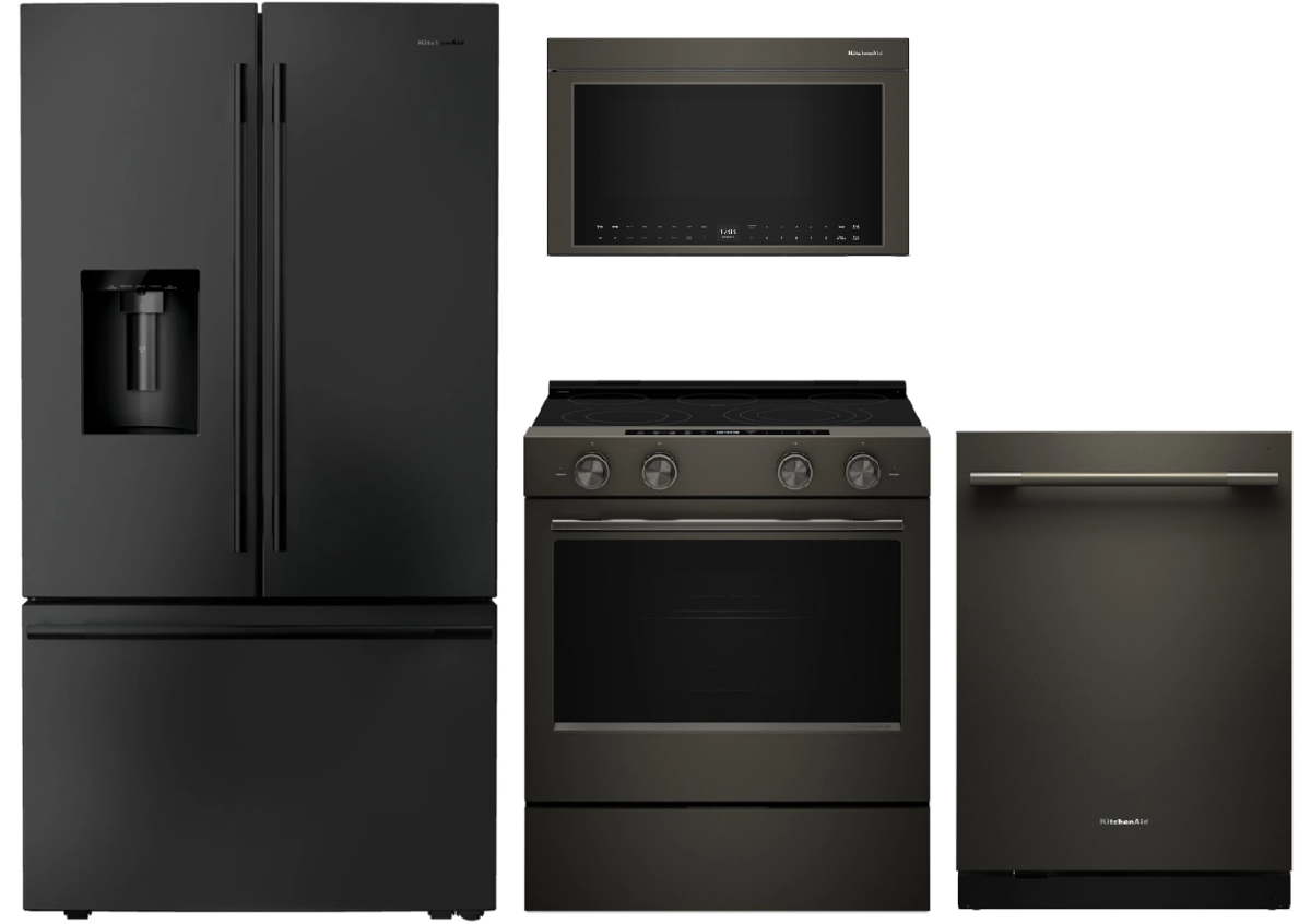 KitchenAid® 36" 30.5 Cu. Ft. Black Ore French Door Refrigerator with Exterior Water and Ice, KitchenAid® 30" Black Ore Slide-In Electric Range, KitchenAid® 24" Black Ore 360° Max Jets™ Third Rack Top Control Built-In Dishwasher with ProDry™ System, and KitchenAid® 1.1 Cu. Ft. Black Ore Over The Range MicrowaveRead More