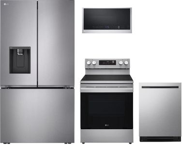LG 36" 25.5 Cu. Ft. PrintProof™ Noble Steel Counter Depth French Door Refrigerator, LG 30" Stainless Steel Freestanding Electric Range with ProBake Convection®, LG 24" PrintProof™ Stainless Steel FlushFit™ Top Control Built-In Dishwasher with 1-Hour Wash & Dry Cycle, LG 2 Cu. Ft. PrintProof® Stainless Steel Over The Range MicrowaveRead More