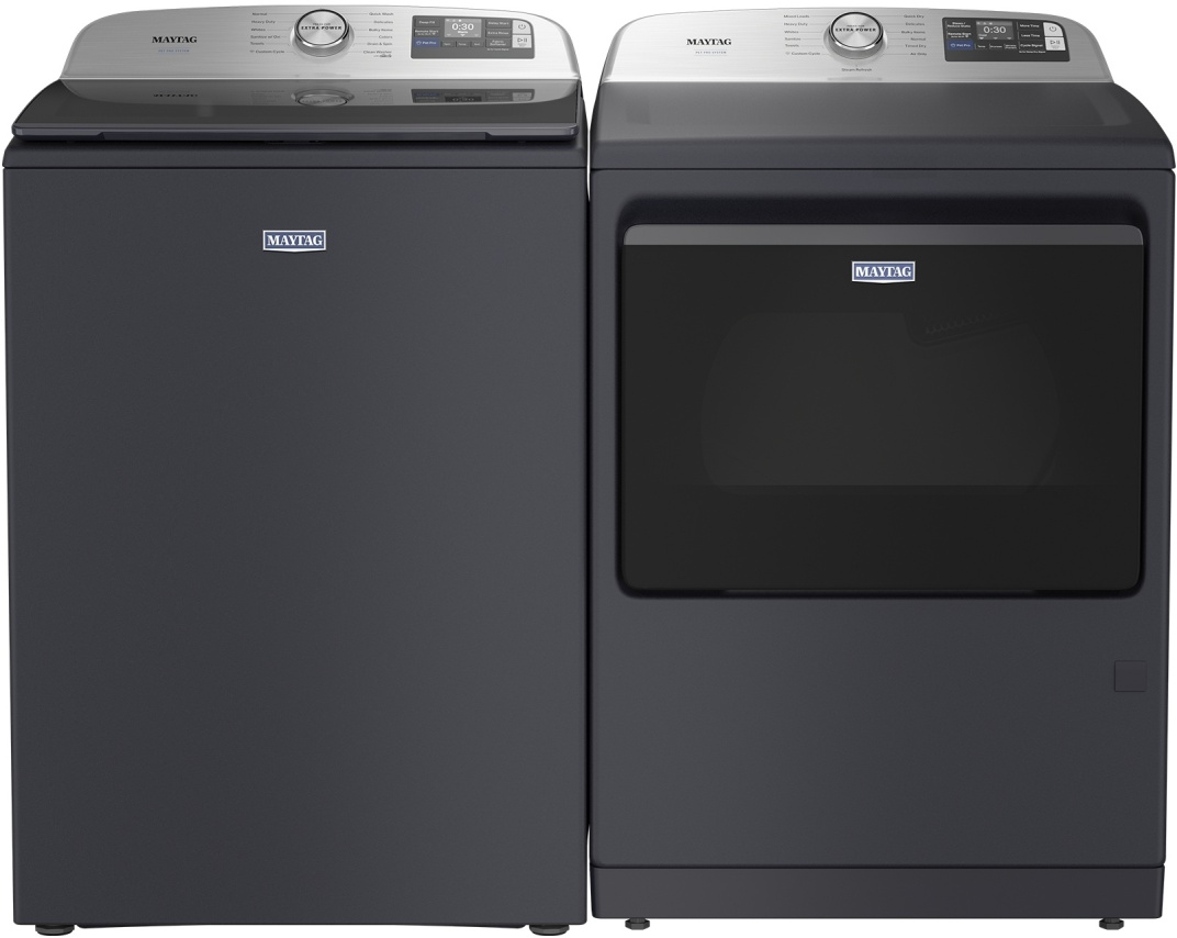 Maytag® Pet Pro Midnight Steel Laundry Pair with 5.3 Cu. Ft. capacity top load washer and 7.4 Cu. Ft. capacity front load gas dryer with pet pro option.Read More
