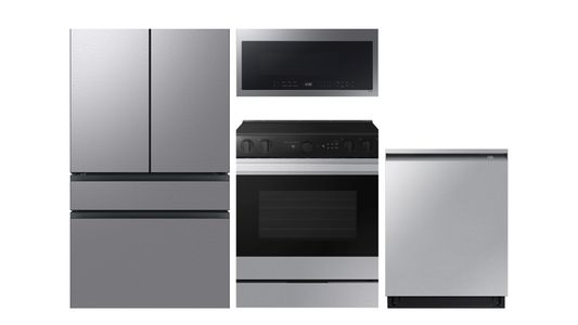 Samsung Bespoke 36 In. 22.9 Cu. Ft. Stainless Steel French Door Refrigerator, Samsung 24" Fingerprint Resistant Stainless Steel Built In Dishwasher, Samsung 2.1 Cu. Ft. Fingerprint Resistant Stainless Steel Over The Range Microwave and Samsung Bespoke 30" Stainless Steel Slide-In Electric RangeRead More