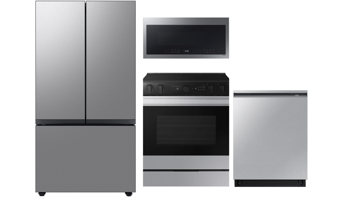 Samsung Bespoke 36 in. 24.0 Cu. Ft. Stainless Steel Counter Depth French Door Refrigerator with AutoFill Water Pitcher, Samsung Bespoke 30" Stainless Steel Slide-In Electric Range, Samsung 24" Fingerprint Resistant Stainless Steel Built In Dishwasher, and Samsung 2.1 Cu. Ft. Fingerprint Resistant Stainless Steel Over The Range MicrowaveRead More