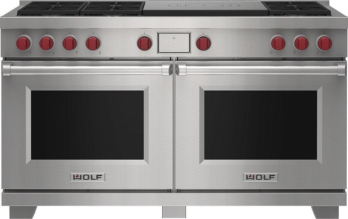 Wolf® 60" Stainless Steel Freestanding Dual Fuel Range and French Top features dual-stacked, sealed burners, Dual VertiFlow™ convection system, Gourmet Mode, 10 chef-created cooking modes, LED backlit control bezels, self-clean, delayed start, timed cook, and Sabbath features.Read More